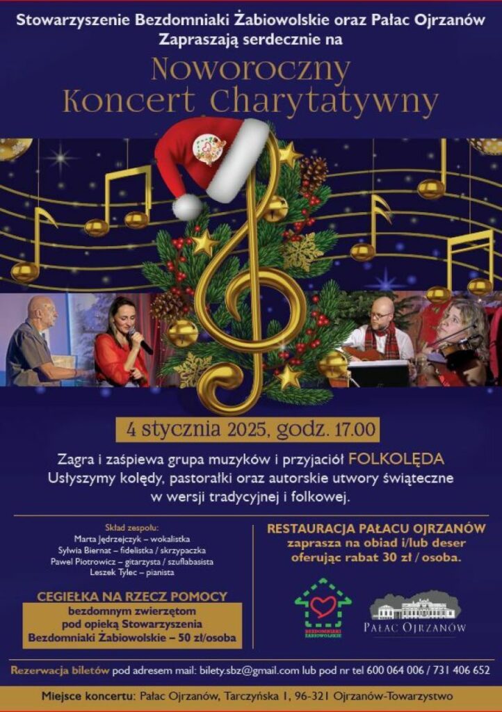 W imieniu Stowarzyszenia Bezdomniaki Żabiowolskie zapraszamy na Charytatywny Koncert Noworoczny, który odbędzie się w Pałacu Ojrzanów dnia 04.01.2025 o godz.17:00.