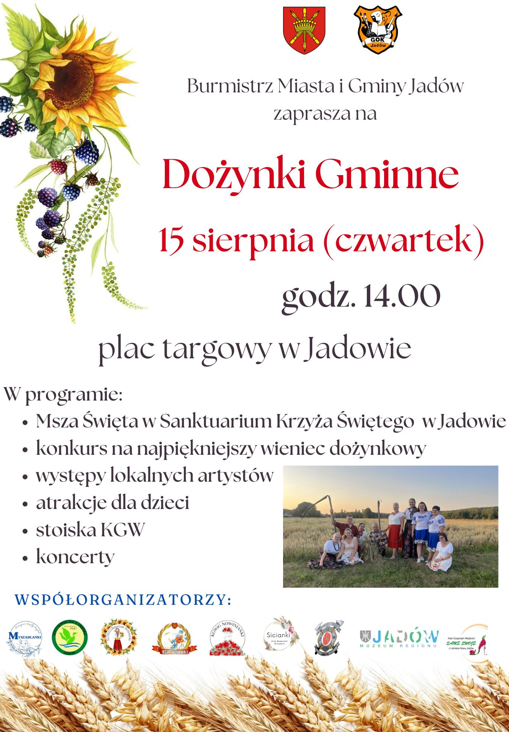 Burmistrz Miasta i Gminy Jadów zaprasza na Dożynki Gminne, które odbędą się 15 sierpnia (czwartek) o godz. 14:00 na placu targowym w Jadowie. W programie przewidziano m.in. Mszę Świętą w Sanktuarium Krzyża Świętego, konkurs na najpiękniejszy wieniec dożynkowy, występy lokalnych artystów, atrakcje dla dzieci oraz stoiska KGW. Uroczystości zakończą się koncertami.
