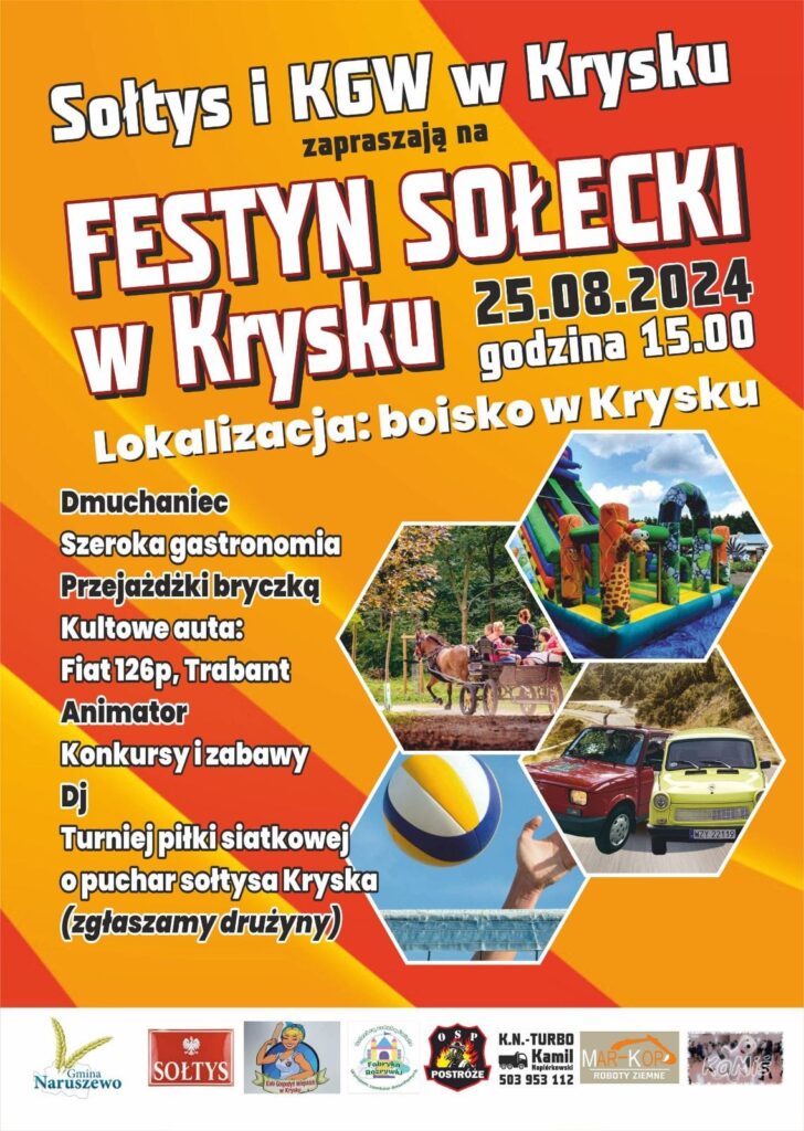 Festyn Sołecki w Krysku odbędzie się 25 sierpnia 2024 roku o godzinie 15:00 na boisku w Krysku. W programie przewidziano liczne atrakcje, takie jak dmuchaniec, szeroka oferta gastronomiczna, przejażdżki bryczką oraz wystawa kultowych aut (Fiat 126p, Trabant). Dodatkowo, na uczestników czekają animacje, konkursy i zabawy, muzyka zapewniona przez DJ-a oraz turniej piłki siatkowej o puchar sołtysa Kryska. Organizatorami wydarzenia są Sołtys i Koło Gospodyń Wiejskich w Krysku.