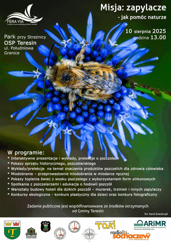Już 10 sierpnia 2025 r. o godzinie 13:00 zapraszamy Was do Parku w Granicach, przy Strażnicy OSP Teresin (ul. Południowa) na wyjątkowe wydarzenie poświęcone pszczołom, trzmielom i innym zapylaczom! W programie czeka na Was mnóstwo atrakcji: