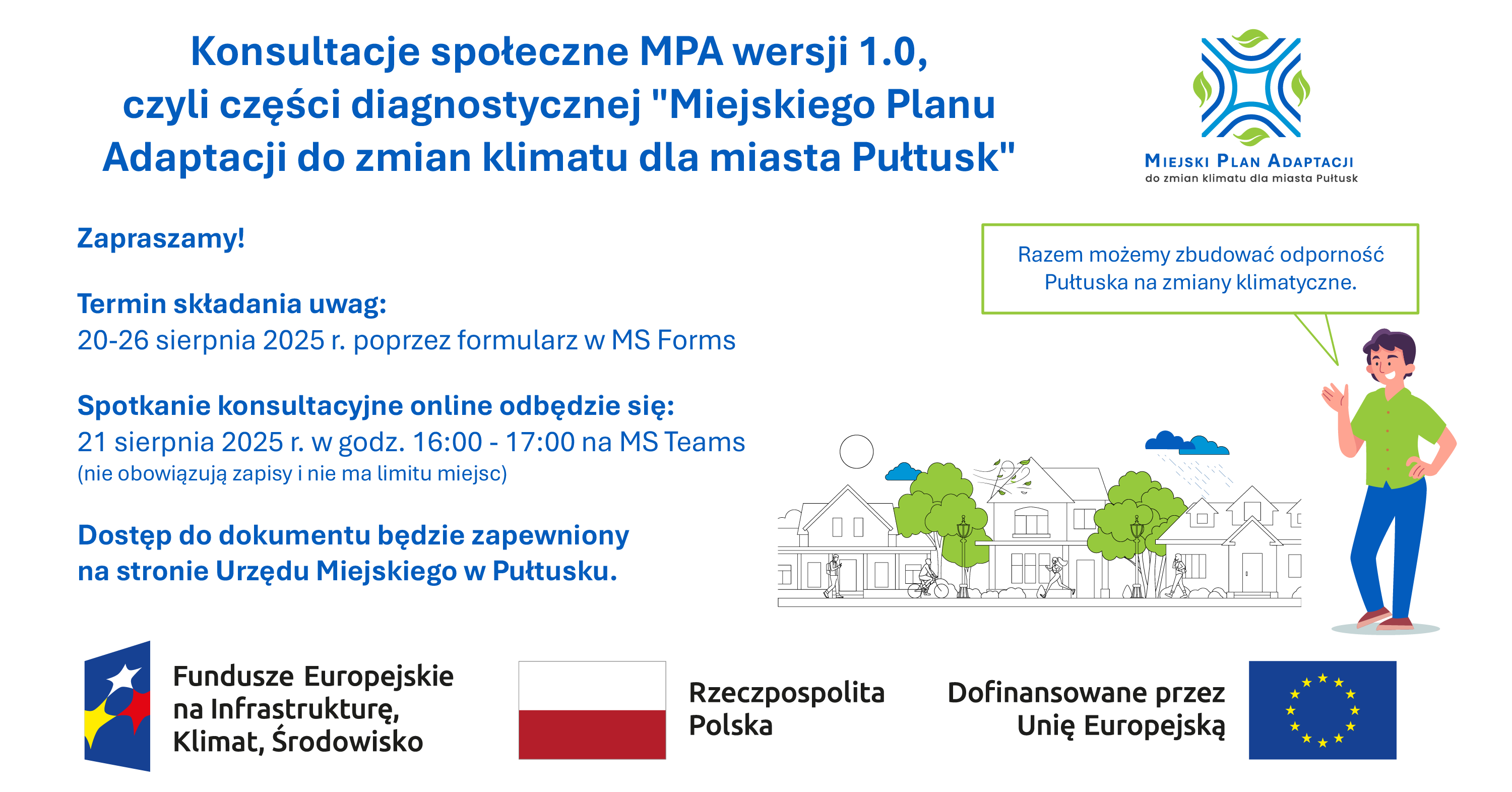 zapraszamy do zapoznania się z projektem części diagnostycznej „Miejskiego Planu Adaptacji do zmian klimatu dla miasta Pułtusk” – MPA wersji 1.0. W dniach