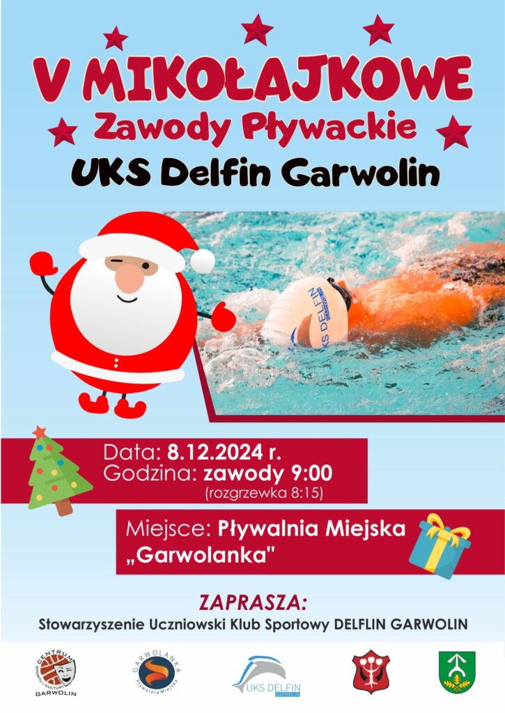 Zapraszamy na V Mikołajkowe Zawody Pływackie UKS Delfin Garwolin, które rozpoczną się 8 grudnia 2024 r. o godzinie 9:00 na Pływalni Miejskiej „Garwolanka”.