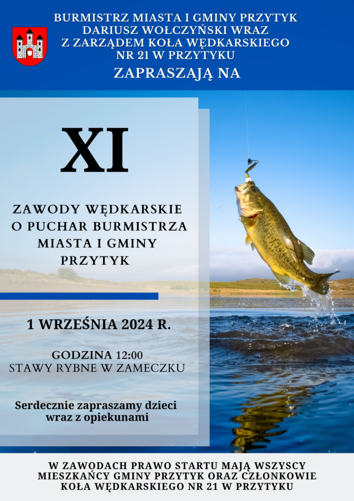 Burmistrz Miasta i Gminy Przytyk oraz Zarząd Koła Wędkarskiego Nr 21 w Przytyku zapraszają na XI Zawody Wędkarskie o Puchar Burmistrza Miasta i Gminy Przytyk.