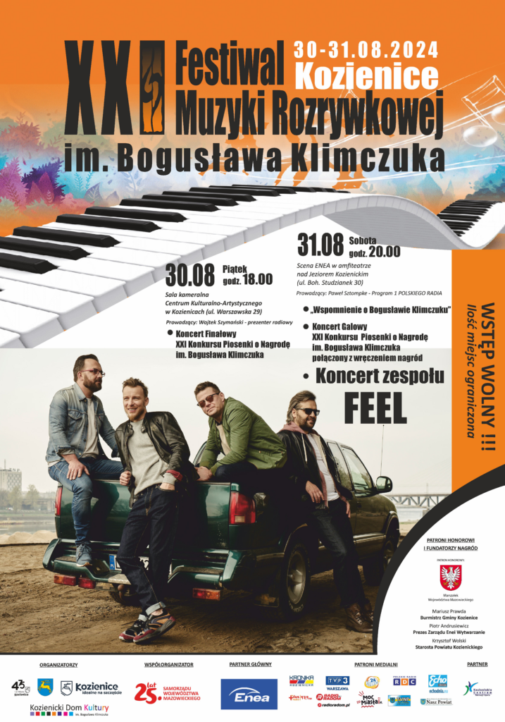 Serdecznie zapraszam na XXI. Festiwal Muzyki Rozrywkowej im. Bogusława Klimczuka, który tradycyjnie odbędzie się w ostatnią sobotę sierpnia, w pięknej scenerii kozienickiego amfiteatru, nad Jeziorem Kozienickim. W programie wydarzenia: Koncert Galowy Konkursu Piosenki o Nagrodę im. Bogusława Klimczuka, muzyczne konkursy, wspomnienie o Kompozytorze oraz koncert Zespołu Feel.