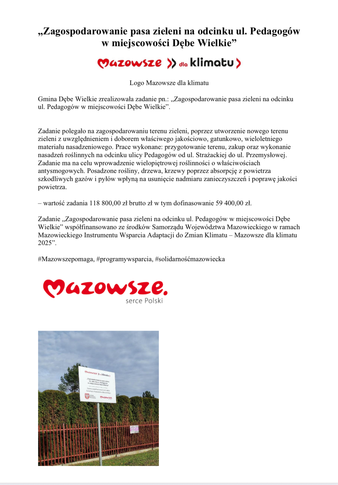 Zadanie „Zagospodarowanie pasa zieleni na odcinku ul. Pedagogów w miejscowości Dębe Wielkie” współfinansowano ze środków Samorządu Województwa Mazowieckiego w ramach Mazowieckiego Instrumentu Wsparcia Adaptacji do Zmian Klimatu – Mazowsze dla klimatu 2025.”
